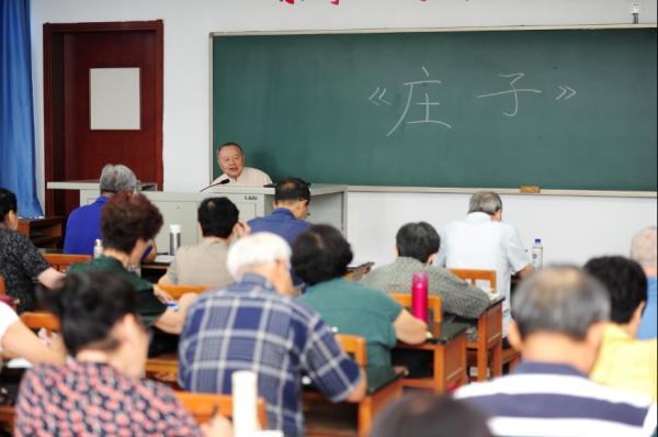 在文史外语系老庄课程的教室内,弥漫着一种不同于声乐课或舞蹈课的沉静气息。上课铃响前,银发学子们早已端坐整齐,随着课程展开,学员们凝神屏息,眼神中不见困惑,而是流露出历经世事后特有的深沉共鸣与思索。学员们一边聆听,一边用笔在讲义上写下批注,笔法苍劲有力。