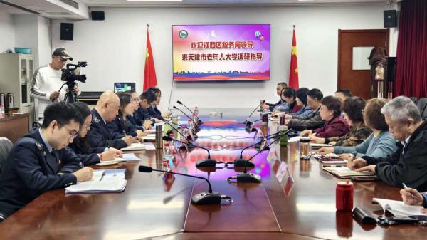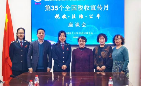为深入开展第35个全国税收宣传月活动,聚焦“税收・法治・公平”主题,切实破解天津市老年人大学涉税难题,优化便民办税服务,2026年4月8日,国家税务总局天津市河西区税务局党委委员、副局长张敏带队,率相关科室及税务所负责人,专程赴我校开展涉税工作专题调研。校党委书记、校长李荣主持座谈会并讲话,副校长贺兰芳、刘桂祥出席会议。党政办公室、教务处、财务处等相关部门负责人参加座谈。